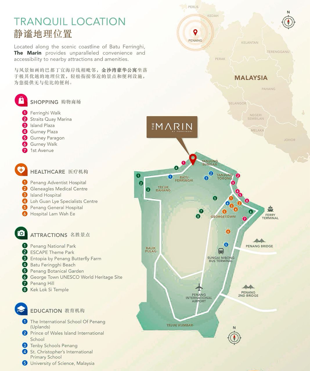 The Marin is ideally located in Penang—an island where east meets west, where modern skyscrapers stand alongside charming kampung houses. It is a vibrant melting pot of culture, heritage, scenery, and history. 坐落于槟城黄金海岸线,这座岛屿融合东西方文化,现代摩天大楼与传统甘榜屋并存,是一个充满文化底蕴与独特风情的国际化城市。